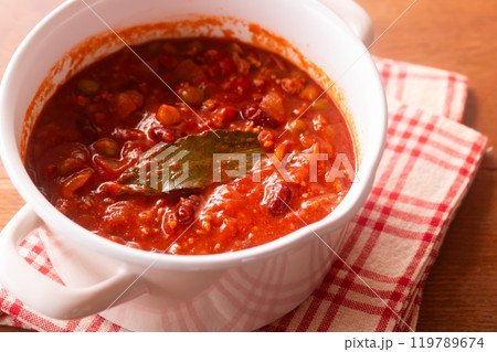 スパイシーだけど辛くない、鍋に入った作りたてチリコンカン