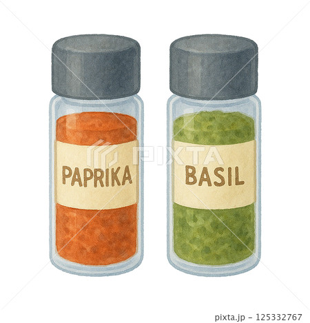 パプリカとバジルのスパイスボトルの水彩イラスト(透過PNG)