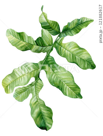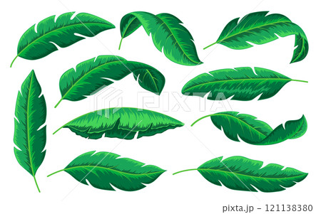 Tropical green leaf set. Natural exotic botanical foliage elements. Hawaiian jungle summer plants. Banana palm leaves for fashion, postcards, packaging wrappers, wedding stationery, greeting cards
