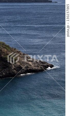 Small rocky islet surrounded by clear turquoise waters off the Ibiza coast.