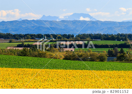 北海道千歳市、ヒマワリが咲くパレットの丘より望む夕張岳【9月】