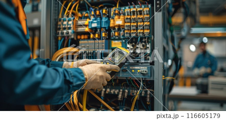 Electrician Working on Industrial Electrical Panel With Multimeter
