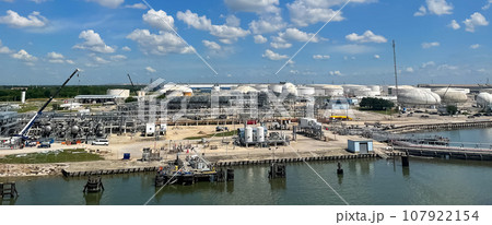 Terminal for loading gas onto ships. LNG equipment near sea Port terminal. Berth for unloading liquefied gas. Supply of liquefied gas across ocean.