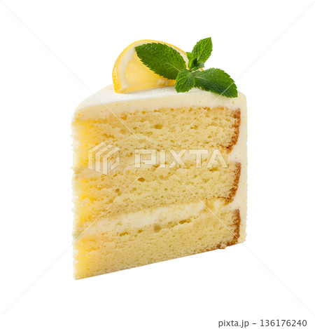 Slice of moist, glazed lemon cake isolated on a white background, perfect for baking blogs and cafe menus