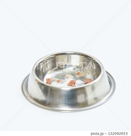 Empty metal pet food bowl with leftover wet food on white background
