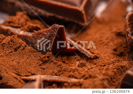 Chocolate pieces in cocoa powder close up