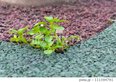 A young plant grew at the junction of crumb rubber flooring in a children's playground. The concept is about the will to live and victory over difficulties, taking advantage of any small opportunity