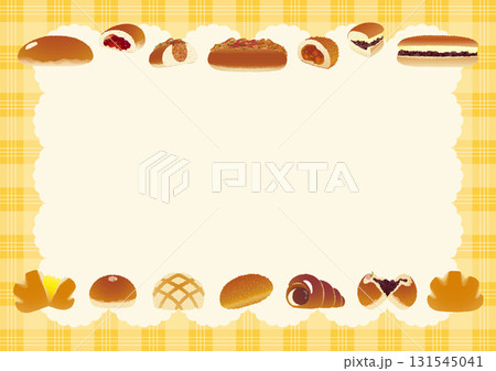パンのフレーム_懐かしいパン勢揃い_チェック柄のテーブルクロスとランチマット_横位置黄橙色