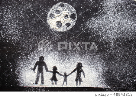 Figure flour in the form of family figures on a black table. Cooking pizza.