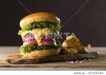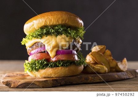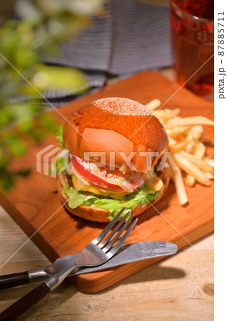チーズハンバーガー(トマトとレタス)、ポテト添え。