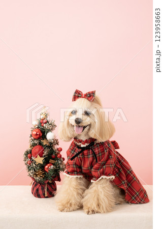 ピンクバックとクリスマスツリーと微笑むマルプーのパンナ