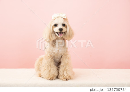 ピンクバックとチューリップと微笑むマルプーのパンナのバストアップ