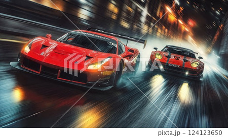 Two red racing GT3 cars speeding through rain-slicked streets with dramatic motion blur. Dynamic night scene captures the intensity of motorsport competition with glowing headlights cutting through