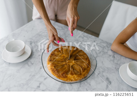 Close up of mother's hands cutting off a piece of blackberry pie for a child at the table