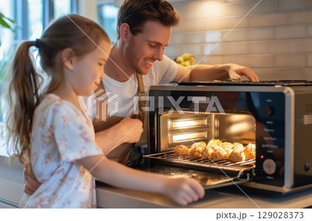 Father and his daughter are having fun baking pastries together, opening the oven door to check on their progress