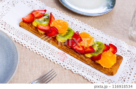 Puff pastry with custard cream, strawberries, tangerine and kiwi
