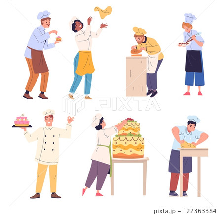 Confectioners. Pastry cooks making birthday cake baking sweets desserts, professional chef prepare cream ingredients, confectioners chief cook characters classy vector illustration