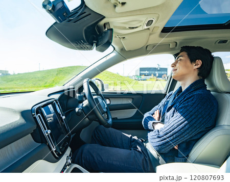 自動運転車でハンズフリー運転を楽しむ男性 クルーズコントロール