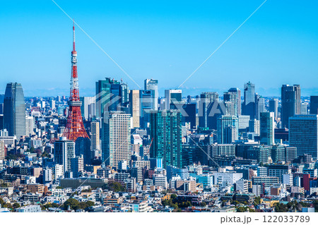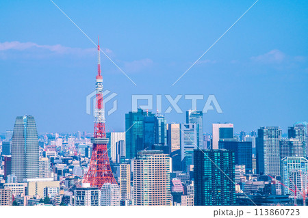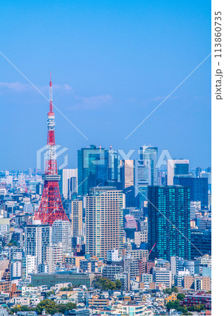日本の東京都市景観 汐留のオフィスビル群や東京タワーなどを望む