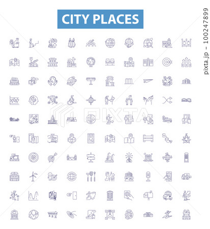 City places line icons, signs set. Town, Metropolis, Village, Borough, Settlement, Suburb, Plaza, Avenue, Street outline vector illustrations.