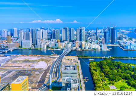 日本の東京都市景観 7月。新時代へ。築地市場跡地などを望む。再開発へ…=6日