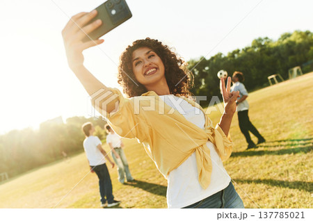 The black smartphone in hand, doing selfie. Young friends are having fun on the field