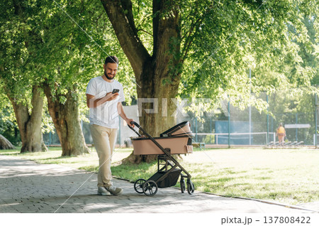 Using smartphone. Father is with cradle, having a walk in the park