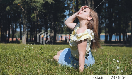 Fashionable young woman enjoying a sunny summer day while standing in a park, surrounded by vibrant greenery and peaceful nature