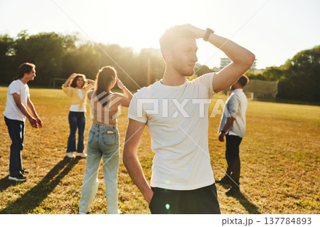 Bright sunlight, guy is standing and posing. Young friends are having fun on the field