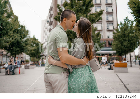 Couple enjoying a casual conversation on a bench outdoors in a city. A couple chats and smiles together while seated on a bench in city Warsaw. Poland. Couple in love visiting Warsaw.