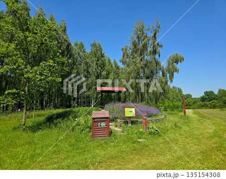 Yellow dog waste bin in green park field with trees and cloudy sky during autumn season in Latvia