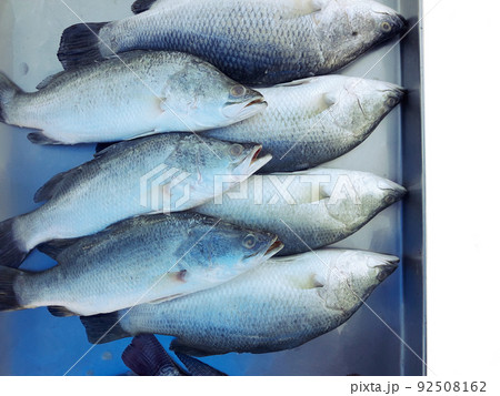 Barramundi or Giant seaperch ( Lates calcarifer ) fish in metal tray at the market islated on white background, Saltwater fish species in Thailand