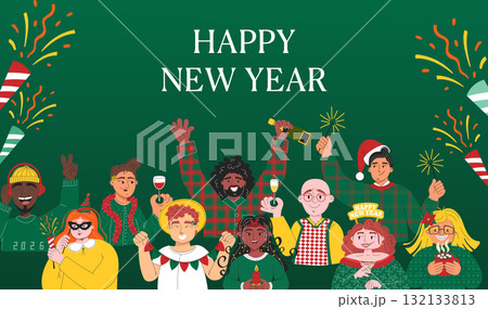 Happy New Year poster with multicultural friends celebrating together