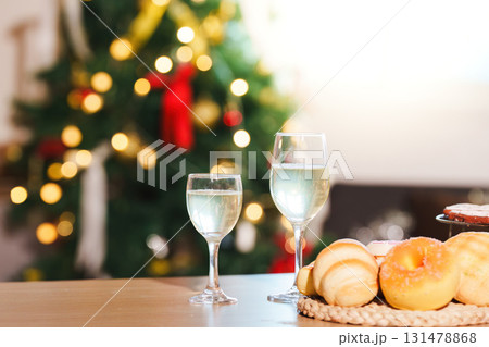New Year Celebration. Sparkling drinks and pastries near a beautifully decorated Christmas tree.