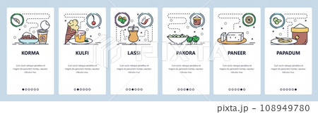 Mobile app onboarding screens. Indian food, lassi, korma, pakora, paneer. Menu vector banner template for website and mobile development. Web site design flat illustration