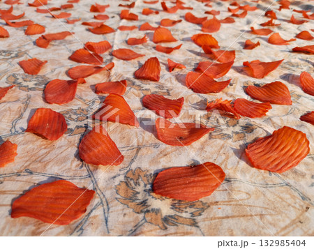 Close-up of homemade sabudana papad drying under sunlight with no background distractions, traditional Indian sago wafers arranged neatly for sun drying