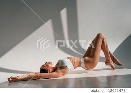 Relaxed, taking a rest. Lying down on a floor. Young caucasian woman with slim body shape is indoors in the studio