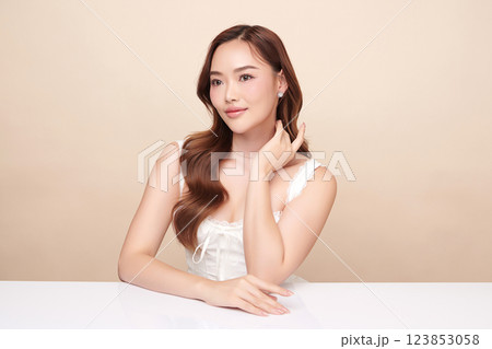 Beautiful young asian woman with clean fresh skin on beige background, Face care, Facial treatment, Cosmetology, beauty and spa, Asian women portrait.