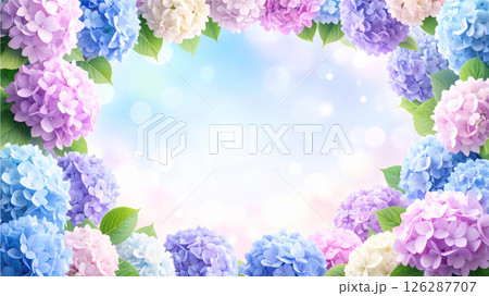 ペールブルーとペールパープルのあじさいのお花のフレーム