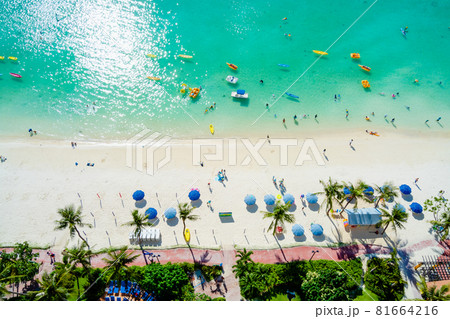コタキナバルの青い海とヤシの木と女性 マレーシア