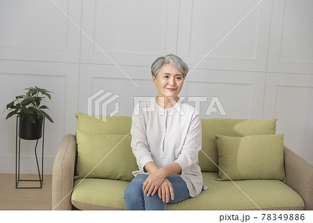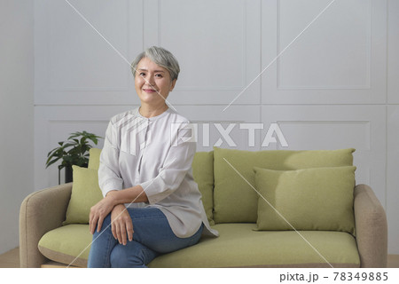 一位銀髮族年長婦女,坐在客廳的沙發上,享受悠閒自在的生活