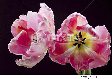 パーロット咲きのピンクのチューリップ・グリーン背景