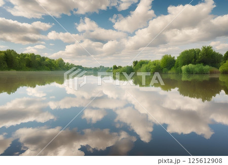 Peaceful river with tree-lined tranquil shore.AI Generated