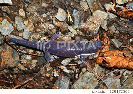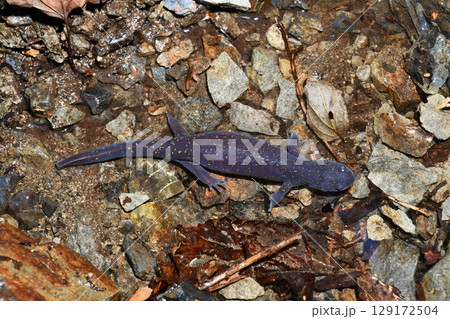 沢の近くを歩くヒガシヒダサンショウウオ雌