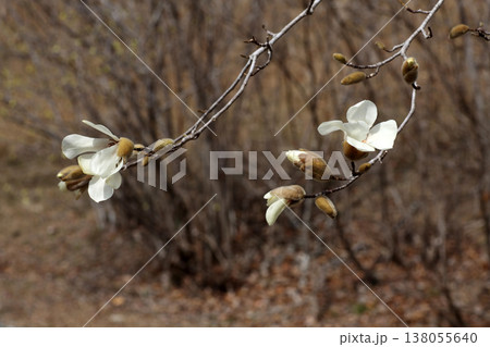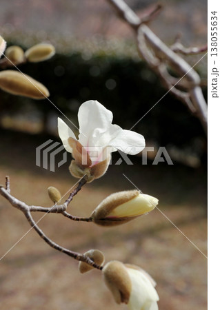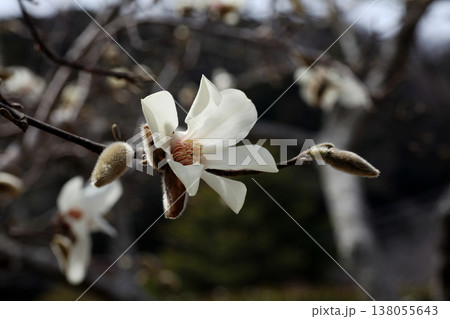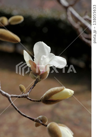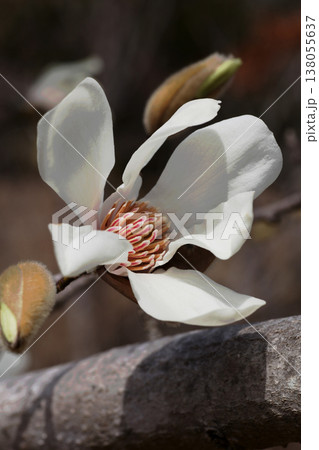 上品で美しい早春の花木コブシの白い花と毛深いつぼみ(晴天下マクロ撮影)