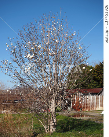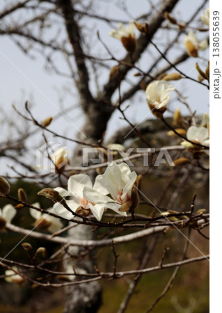 春の快晴、青空をバックに見上げるコブシの白花とベージュ色の朽ち花のコントラストが美しい枝振り画像