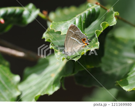 ブナの枝先でテリ張りするヒサマツミドリシジミ