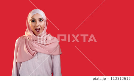 Wow surprise. Amazed face. Positive reaction. Impressed astonished excited happy woman in hijab isolated on red empty space background.