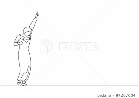 Single continuous line drawing happy Arab businesswoman standing with crossing arms and look down. Saleswoman celebrates salary increase from company. One line draw graphic design vector illustration
