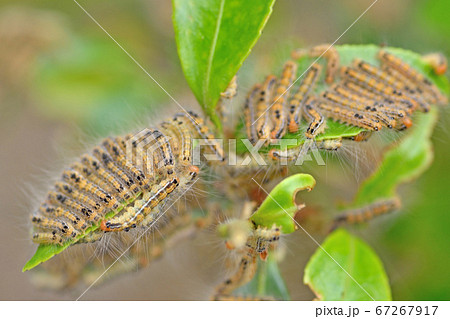 生き物 昆虫 チャドクガ、行儀よく並んで食事中の幼虫。注意して手早く駆除しないと大変なことに・・・